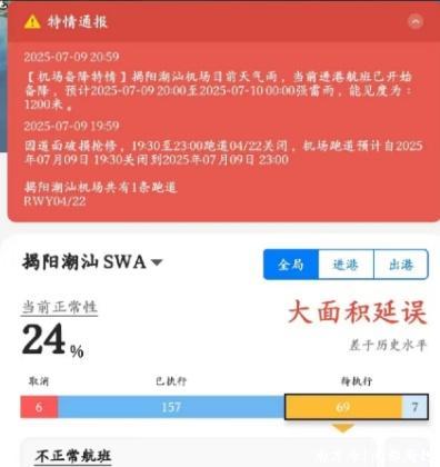 7月9日,多名网友发帖称,广东揭阳潮汕国际机场多趟航班出现延误,“延误原因为揭阳出现大雨,跑道被雷劈,出现损毁”。网友发布其收到的“特情通报”显示,该机场共有1条跑道,“因道面破损抢修,19:30至21:00跑道04/22关闭”。